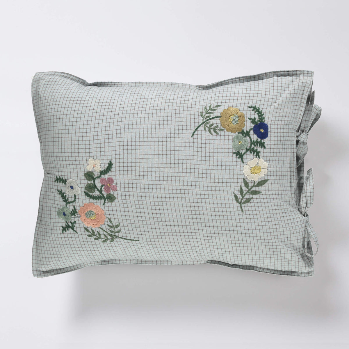 This beautiful light blue check cushion cover has two colourful floral embroideries and layers back with most of our collection .