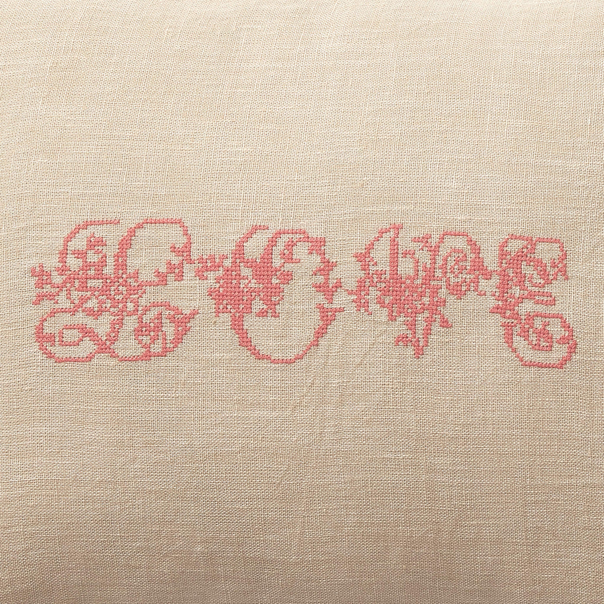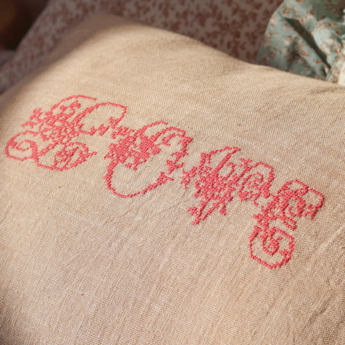 Our Vintage cream Linen Cushion Cover has an intricate vintage inspired cross stitch embroidered floral design in a pop of fluorescent pink , the cushion looks beautiful with any combination of camomile bedding or room setting.