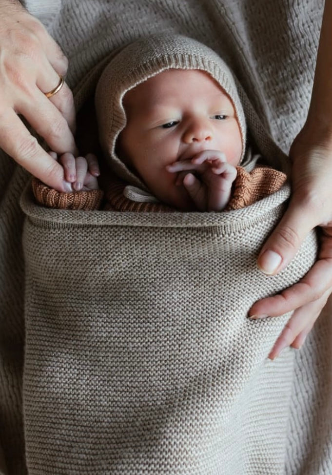 - Wrap your little one in this knitted cocoon. Keeps your baby cosy and warm.