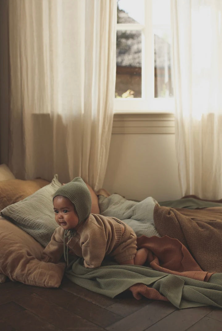 A soft seamless knitted bonnet made in 100% merinowool.